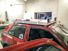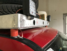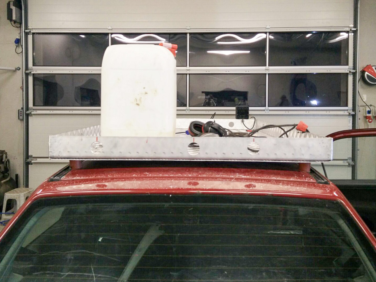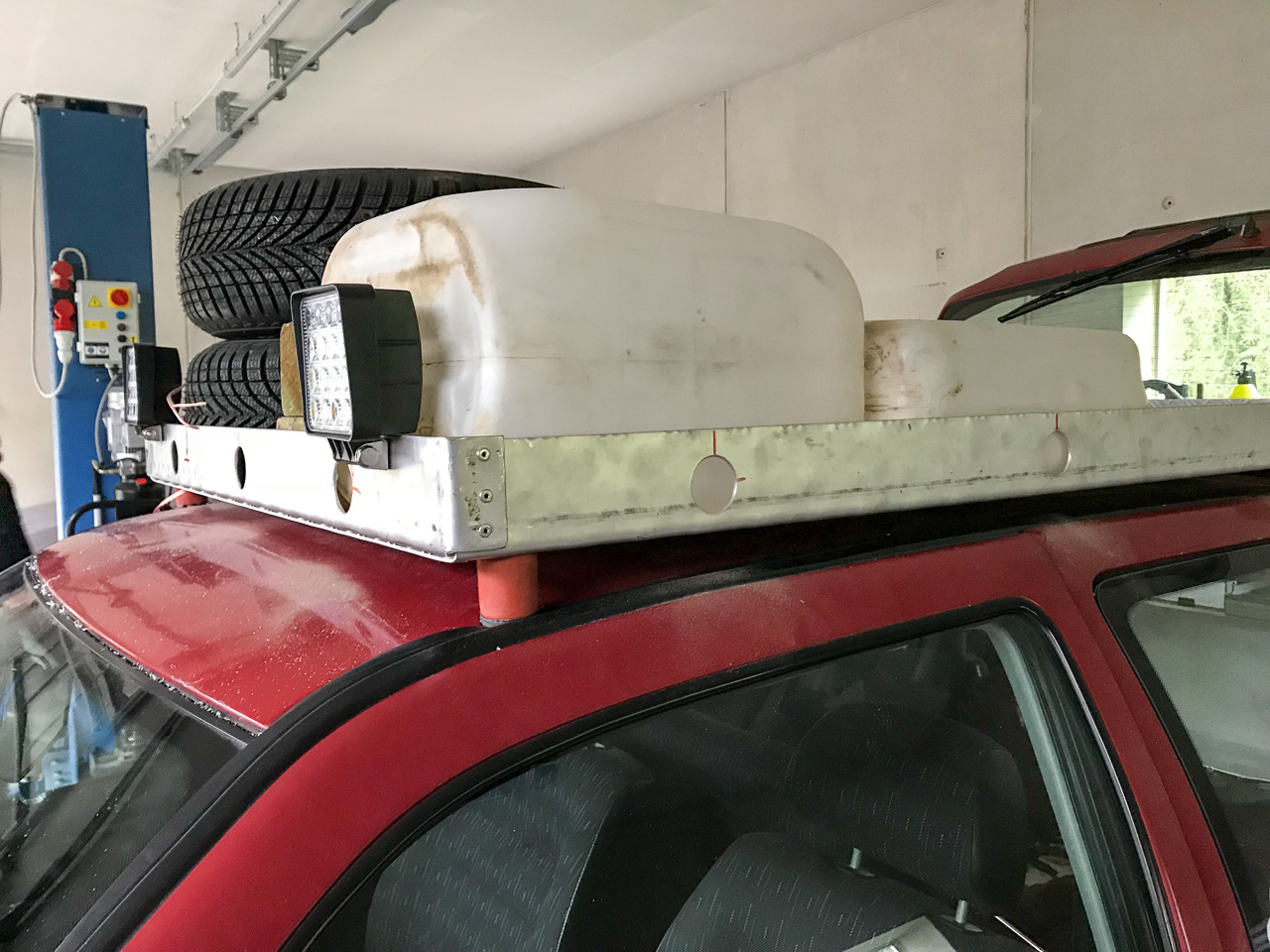 Alles in allem sind wir mit der Konstruktion mehr als zufrieden: Löcher in den Seitenwänden zum Festbinden des Ladeguts, welches aus vier Ersatzreifen, 3x 20L Benzinkanister und einem Wasserkanister besteht, und zwei hochleistungsfähige LED-Scheinwerfer, die wir bei Bedarf aktivieren können.