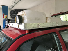 Die Konstruktion ist sozusagen "fail-safe": Man erstelle eine Wanne aus Alu-Blech, bohre 4 Löcher durch das Dach von Brunhilde, und schraube zwischen Alu-Wanne und Dach 4 Türstopper aus Gummi, um entsprechend Abstand und Dämpfung zu haben. Voilá, der Dachträger ist fertig :-D