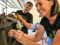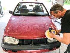 Zuerst stand eine gründliche Naßwäsche auf dem Programm, um danach mit Poliermaschine und Fingernagelfeile die Details zu überarbeiten. Mit vereinten Kräften (von Chef-Strategen Christian und Team-Chefköchin Anna) machte Brunhilde eine optische Verwandlung durch, die an diverse Naturwunder und Märchenerzählungen erinnern lässt.